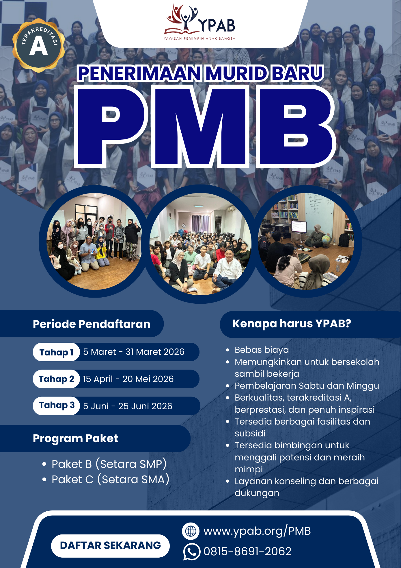 PKBM Pemimpin Anak Bangsa (YPAB) membuka pendaftaran murid baru Pendidikan Kesetaraan untuk tahun ajaran 2025/2026, untuk jenjang Paket B (setara SMP) dan Paket C (setara SMA). Di tahun ajaran ini hanya dilakukan penerimaan peserta didik baru dengan pembelajaran tatap muka, dan pembelajaran dilakukan di Kota Tangerang Selatan.
