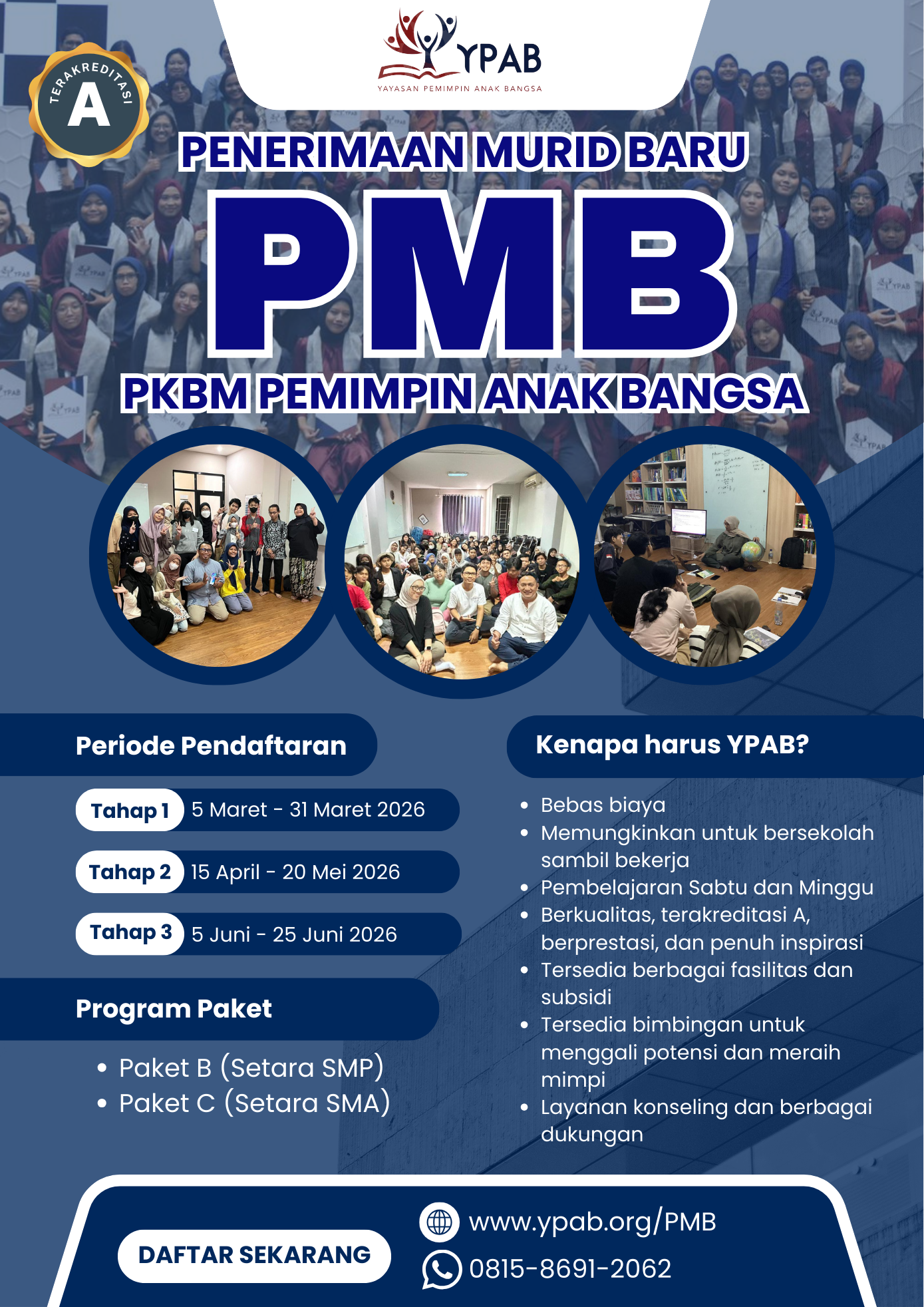 PKBM Pemimpin Anak Bangsa (YPAB) membuka pendaftaran murid baru Pendidikan Kesetaraan untuk tahun ajaran 2026/2027, untuk jenjang Paket B (setara SMP) dan Paket C (setara SMA). Di tahun ajaran ini hanya dilakukan penerimaan peserta didik baru dengan pembelajaran tatap muka, dan pembelajaran dilakukan di Kota Tangerang Selatan.